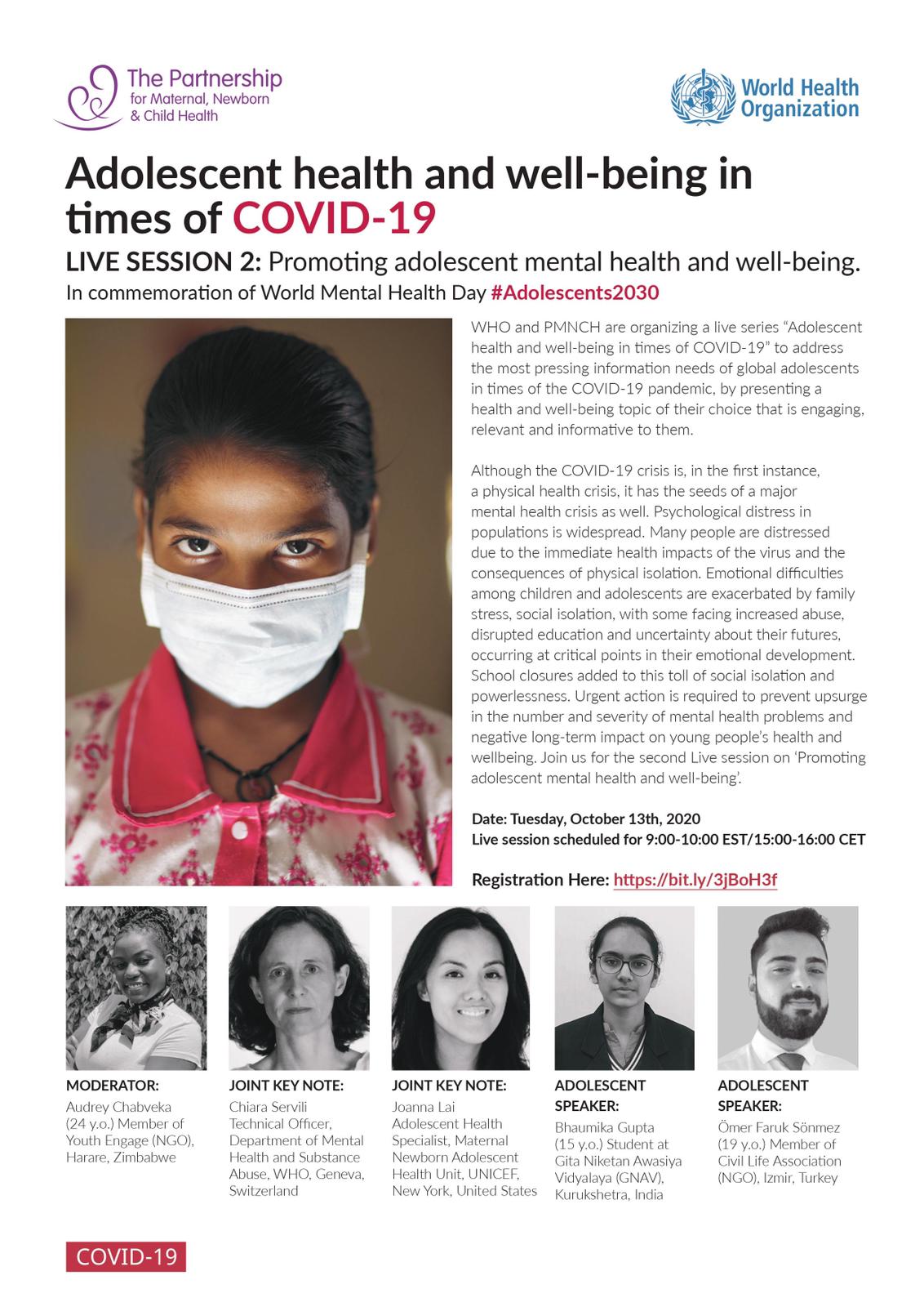 İzmir Demokrasi Üniversitesi Diş Hekimliği Fakültesi 3.sınıf öğrencisi Ömer Faruk Sönmez, Dünya Sağlık Örgütü (WHO) ve Anne, Yenidoğan ve Çocuk Sağlığı Ortaklığı (PMNCH) tarafından organize edilen ‘‘COVID-19 Zamanlarında Gençlik Sağlığı’’ canlı seminer serisinin ikinci etkinliği olan ‘’Gençlerin Mental Sağlık ve İyi Olma Hallerinin İyileştirilmesi’’ konulu seminerde konuşmacı olacaktır.